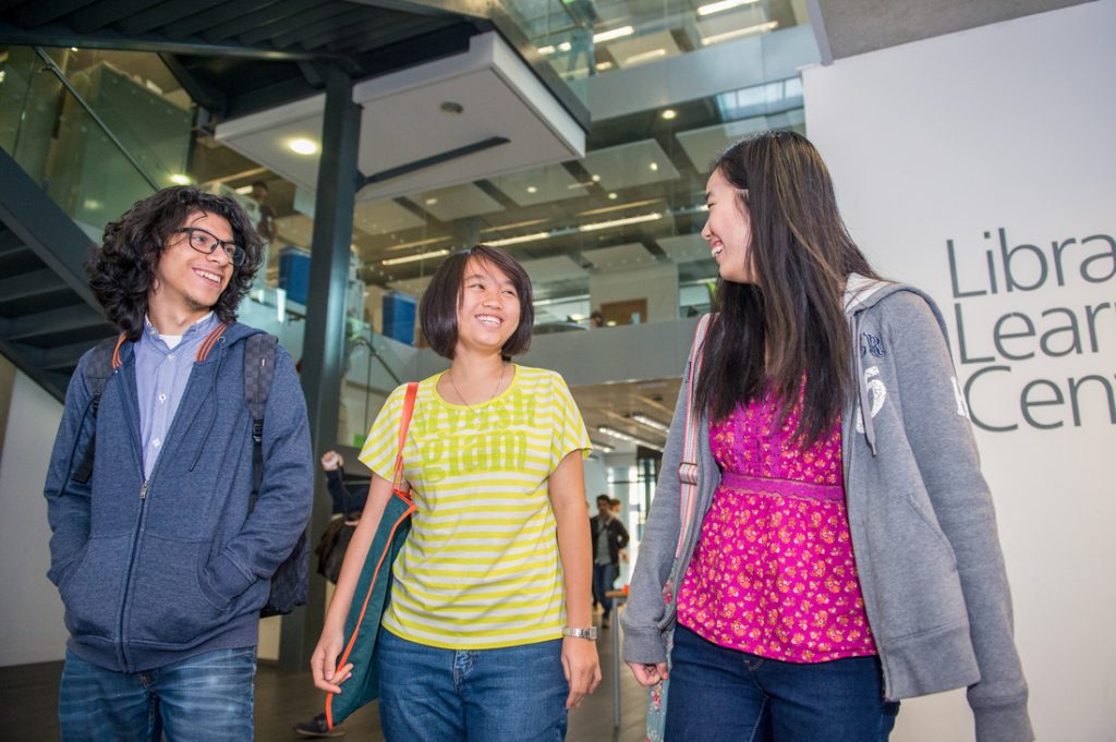 Surrey ISC students outside the library on campus at the University of Surrey.