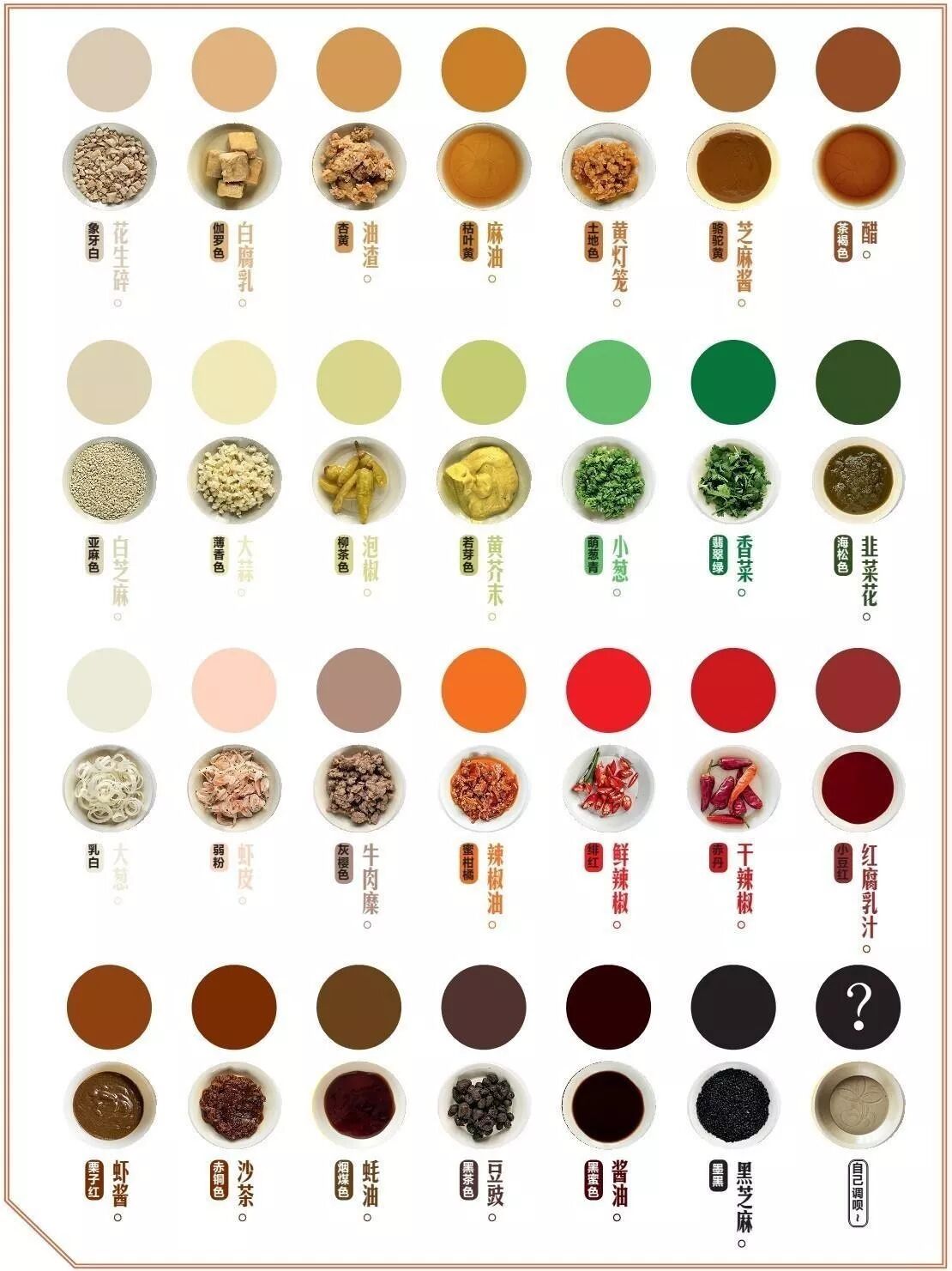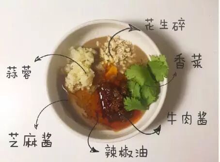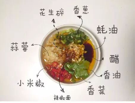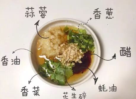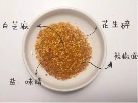 白芝麻,些许盐和味精,花生碎,根据口味下辣椒粉,口味重可以下些孜然。