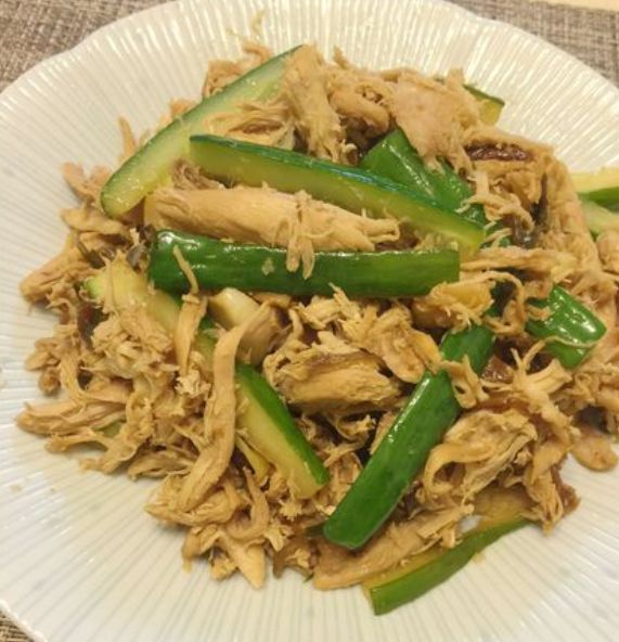 如果有买到有机的小黄瓜,我会直接使用。如果不是,会过水一下,然后丢进冰水。只要把小黄瓜用大菜刀大力的拍拍,让它裂开,加入鸡肉、蒜茉、姜茉、一点麻油、酱油、糖和水。