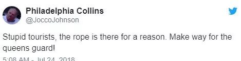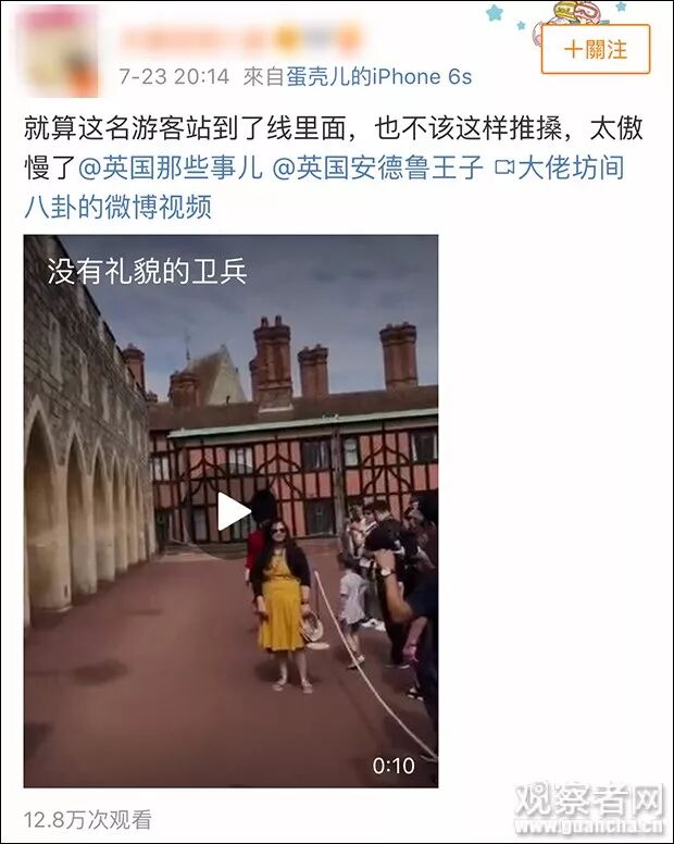 视频立刻引发热议,有国内网友将其发布在新浪微博上,并配上标题《没有礼貌的卫兵》,其在配文中称:“就算这名游客站到了线里面,也不该这样推搡,太傲慢了”,还@ 了英国安德鲁王子(系英国女王伊丽莎白二世次子)。