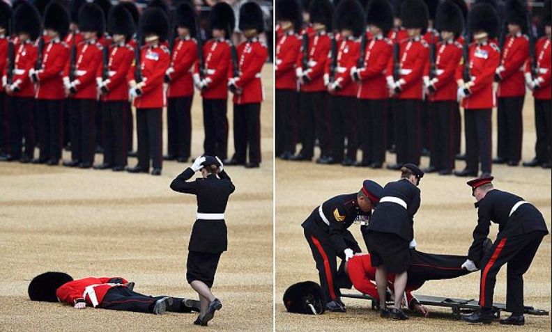 记得上次女王卫兵上新闻,还是中暑晕倒。。。