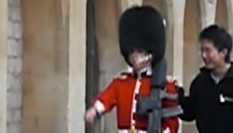 顺便还回顾2015年,一位亚裔男子在温莎城堡,加入了卫兵行进,并伸出手放在了士兵身上。