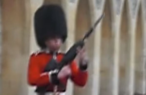 当时视频显示,士兵大喊道”Get back from the Queen’s Guard!”,同时还用刺刀步枪对着那名男子。