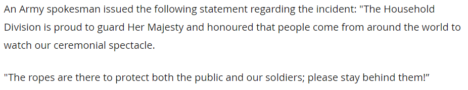 据报道,女王卫队应该接受过如何应对游客和哪些距离太近的人的训练。之前一位摄影师挡路了,也是说推就推。
