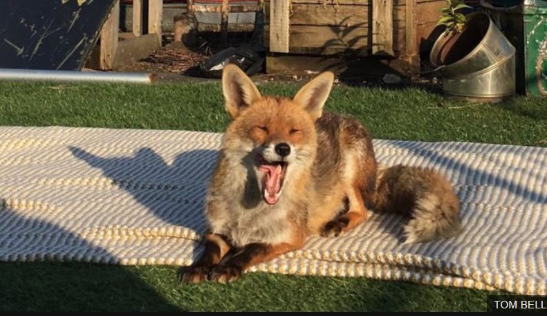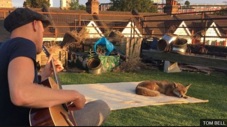 不过,这只小狐狸,既然能到房顶占着毯子晒日光浴,估计也是不怕人的。果然,Tom表示,他成功的靠近小狐狸,顺便还摸了摸,外加现场音乐演奏。