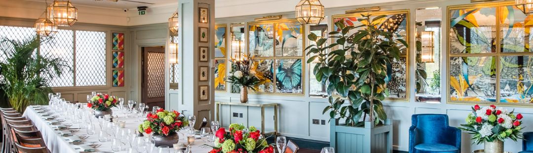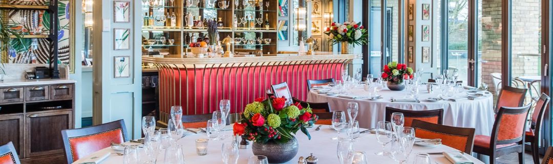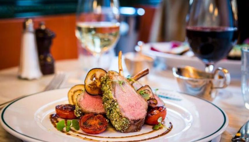 圆圆的餐桌上摆放美丽的餐具,定制的餐巾,闪亮的碗碟,还有丰富的菜单。涵盖牛排,沙拉,英国“家常菜”,新鲜鱼类。